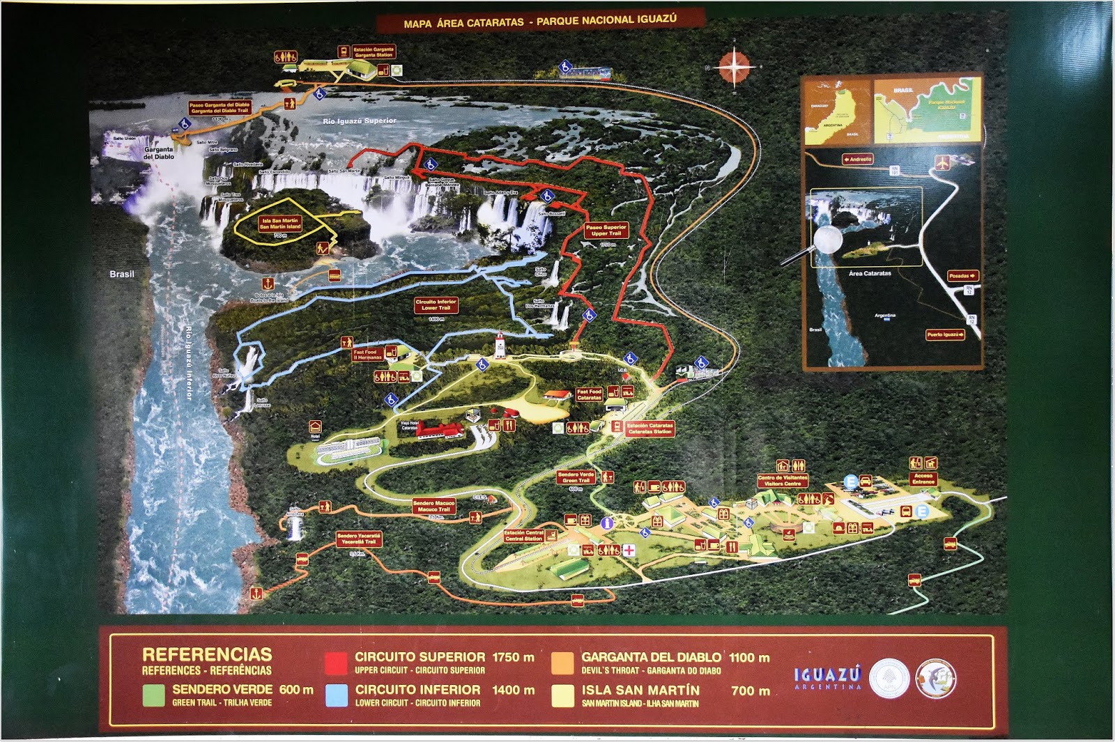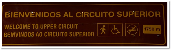 A szálloda recepciója mellett "véletlenül" ott volt egy túrákat szervező cég irodája, és kiderült, hogy pont másnapra van egy spanyol nyelvű csoportjuk. Így lett, hogy az argentin oldalon kezdtük a látogatást. A taxi+belépő kombó drágábban jött volna ki kettőnkre, ráadásul akkor magunknak kellett volna intézni a vízumot a határon, ami ki tudja mennyi idő, addig is ketyeg a taxióra. A busz mint tömegközlekedés ugyan olcsóbb, de nem akartunk vacakolni vele, és az is időveszteség, mert a határon le kell szállni, elintézni a vízumot, aztán megvárni a következő buszt és azzal tudtunk volna tovább menni. Ráadásul visszafele is figyelni kell a buszjáratokat, nehogy lemaradjunk az utolsóról... Szóval kényelmi szempontok miatt a csoportot választottuk és nem bántuk meg. Az idegenvezetők nyilván ismerik a járást, pillanatok alatt megvolt az egész társaságnak a pecsét az útlevélbe, ráadásul még egy plusz állomást is beiktattunk a három ország (Argentína, Brazília és Paraguay) határán levő emlékműhöz.