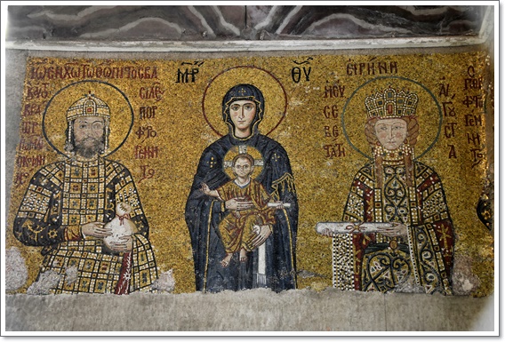 II. Komnénosz Bizánci Császár és neje, Szent Eiréné (Irén), a kis Jézust tartó Szűzmária két oldalán |